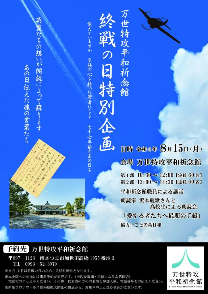 講話・朗読会「終戦の日特別企画 覚えていますか 至純の心を持った若者たちを 七十七年前のあの日を」 2022年8月15日 最終更新日時 : 2026年3月12日 eikouadmin 開催期間:令和4年8月15日(月)